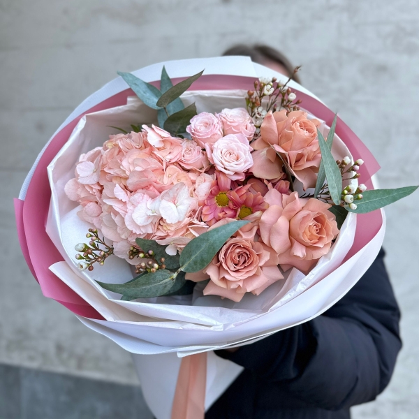 Un buchet rafinat, în tonuri delicate de roz și nude, creat pentru a transmite eleganță și sensibilitate. Hortensia roz oferă volum și un aspect aerat, fiind armonios completată de trandafiri clasici și trandafiri spray. Crizantemele adaugă profunzime vizuală, waxflower-ul aduce accente fine, iar eucaliptul echilibrează compoziția cu o notă fresh și modernă.