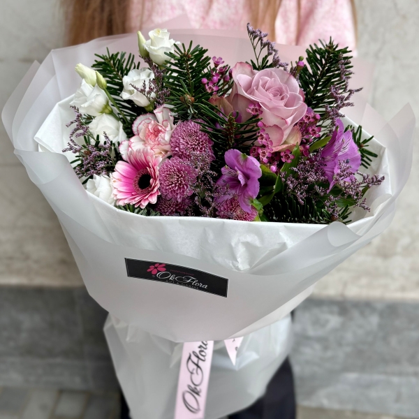 Buchetul conține trandafir roz, gerbera roz, crizanteme santini mov, garoafă alb-roz, lisianthus alb, alstroemeria mov, completate de statice (limonium) și verdeață naturală de brad, care adaugă volum și prospețime compoziției. Florile sunt armonios așezate și ambalate într-un packaging elegant, care pune în valoare culorile și textura fiecărui element.
