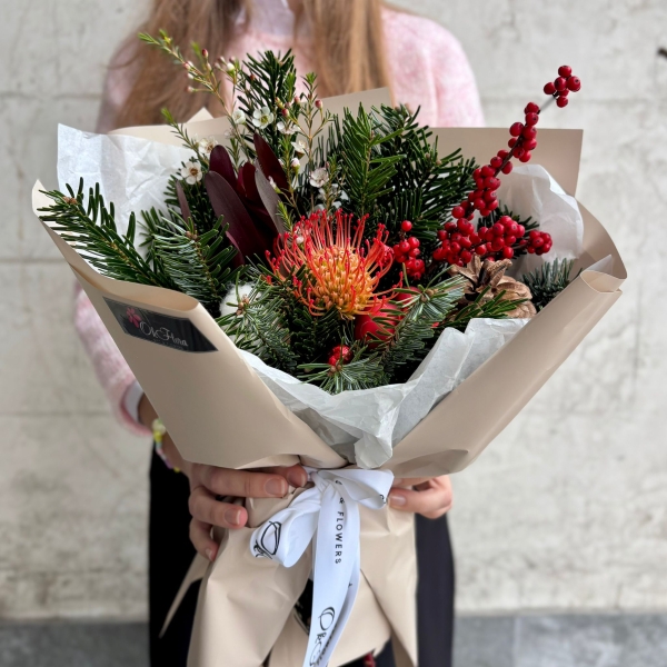 Buchetul conține protea (leucospermum), leucadendron, ramuri de brad natural, hypericum roșu, bobițe decorative, conuri de pin și verdeață de sezon, completate de detalii florale fine și decorațiuni discrete în tonuri de roșu. Florile și verdeața sunt armonios aranjate și ambalate într-un ambalaj elegant, care pune în valoare textura și volumul buchetului.