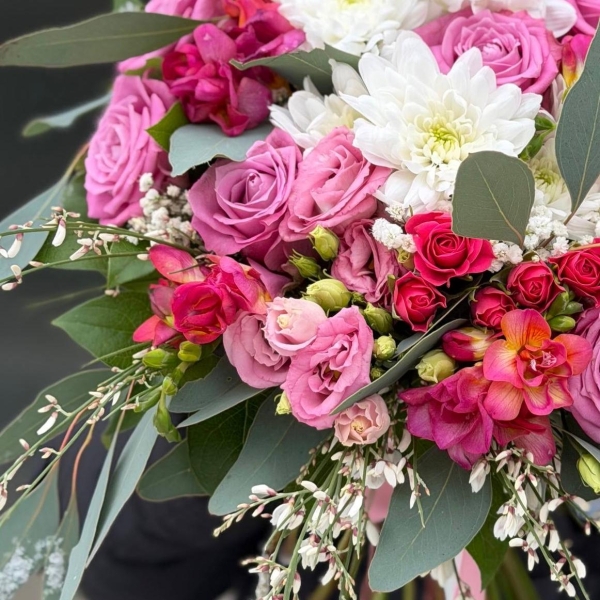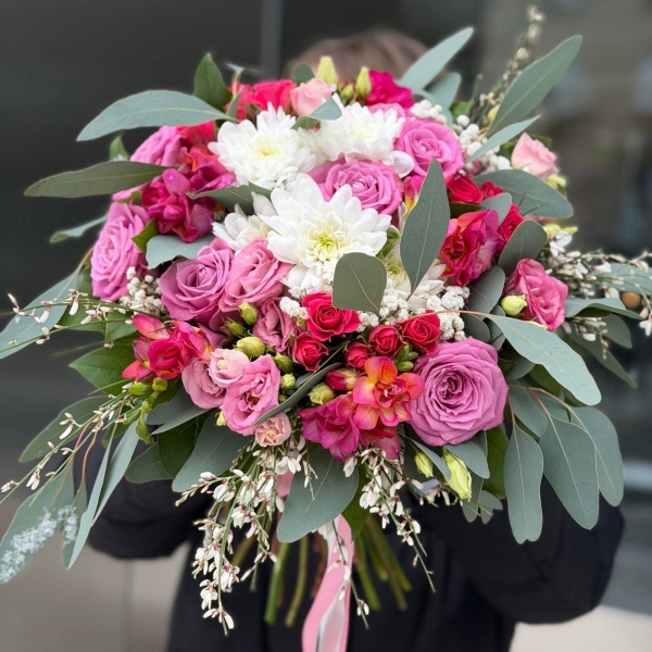 Acest buchet elegant impresionează prin armonia nuanțelor de roz și prospețimea florilor albe, creând o compoziție rafinată și feminină. Trandafirii roz și spray adaugă romantism și volum, crizantemele albe oferă luminozitate, iar lisianthusul și frezia completează buchetul cu finețe și naturalețe. Eucaliptul aduce un contrast modern și un aer proaspăt.